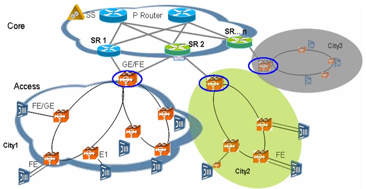 綜合接入主要關(guān)注語音和少量寬帶業(yè)務(wù)和專線,上行接口一般是E1和FE/GE。傳統(tǒng)窄帶語音業(yè)務(wù)、TDM專線等或MSAN使用于窄帶交換機(jī)組網(wǎng)的時(shí)候采用E1上行方式,其它時(shí)候采用FE/GE上行。接入層面采用的承載網(wǎng)設(shè)備必須同時(shí)能夠支持E1和FE/GE接入,因此承載網(wǎng)設(shè)備必須具備多業(yè)務(wù)傳輸特性,傳統(tǒng)SDH設(shè)備,傳統(tǒng)LANSwitch設(shè)備無法滿足組網(wǎng)需求。