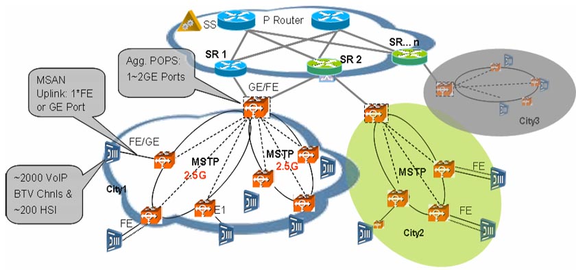 MSAN已經(jīng)逐漸成為基于IP架構(gòu)的下一代電信網(wǎng)建網(wǎng)的主要接入方式,近幾年越來越多的固網(wǎng)運(yùn)營商普遍采用綜合接入(MSAN)建網(wǎng)模式,如英國的最大固網(wǎng)運(yùn)營商英國電信的21CN網(wǎng)絡(luò),中國的最大固網(wǎng)運(yùn)營商中國電信、中國網(wǎng)通,巴西的最大固網(wǎng)運(yùn)營商Telemar等。而MSTP單一平臺(tái)具備支持MSAN接入的所有業(yè)務(wù)的承載要求,且成本最低。華為公司MSTP設(shè)備具有強(qiáng)大的數(shù)據(jù)接入?yún)R聚及傳送特性,并通過Metro