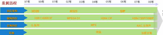 多媒體會議主要提供語音、視頻、數(shù)據(jù)的融合會議解決方案。傳統(tǒng)的多媒體會議在2001年前主要是專線(E1/ISDN)H.320的視頻會議系統(tǒng)。隨著寬帶(LAN/ADSL)的發(fā)展,2002年至2007年主要是H.323的視頻會議系統(tǒng),同時兼容H.320的專線視頻會議系統(tǒng)。2007年前音頻的主要是8k采樣的G.7xx協(xié)議,2007年后寬頻語音AAC-LD已經(jīng)普遍使用。視頻2007年前主要是4CIF格式以下的標(biāo)清系統(tǒng),2007年后H264