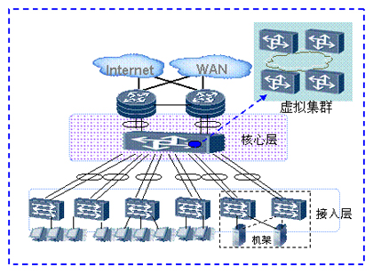 如上圖所示,整個(gè)數(shù)據(jù)中心網(wǎng)絡(luò)通過(guò)虛擬集群技術(shù),多個(gè)核心層設(shè)備虛擬為一臺(tái)設(shè)備。通過(guò)增加核心節(jié)點(diǎn),提供無(wú)阻塞的網(wǎng)絡(luò)能力,接入更多服務(wù)器。服務(wù)器的規(guī)?梢詮3000臺(tái)“無(wú)級(jí)擴(kuò)展”到數(shù)萬(wàn)臺(tái)。在滿足企業(yè)日益增長(zhǎng)的業(yè)務(wù)需求的同時(shí),并不增加網(wǎng)絡(luò)的復(fù)雜度,減少管理和維護(hù)的成本。