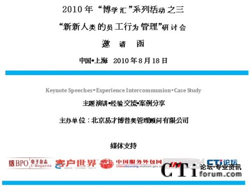 21世紀(jì)什么是貴?人才最貴!人才是企業(yè)持續(xù)發(fā)展的唯一生命之源。易才博普奧公司(CTG BPO)作為專(zhuān)業(yè)的人力資源外包專(zhuān)家、服務(wù)外包產(chǎn)業(yè)專(zhuān)業(yè)人才租賃供應(yīng)商,近年來(lái)在業(yè)界積累了大量?jī)?yōu)秀的一線人才租賃經(jīng)驗(yàn)并得到廣泛的業(yè)界好評(píng)!2010年伊始,易才博普奧推出了“博學(xué)匯”系列客戶(hù)交流會(huì)活動(dòng),旨在搭建一個(gè)與行業(yè)精英、業(yè)內(nèi)專(zhuān)家互動(dòng)交流的平臺(tái),學(xué)習(xí)、體驗(yàn)和分享多元文化,促進(jìn)和推動(dòng)彼此之間的交流與合作。