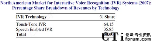 CTI論壇(ctiforum)11月3日消息(記者 楊佳林):根據(jù)Global Industry Analysts, Inc. 2010研究報(bào)告指出, 語(yǔ)音識(shí)別每?jī)赡甑膹?fù)合成長(zhǎng)率(CAGR)為97.7%, 其中美, 加占65%。以2007年的IVR銷售營(yíng)業(yè)額而言, 具有語(yǔ)音識(shí)別功能的IVR系統(tǒng)已占有的1/3的比例, 顯示出語(yǔ)音識(shí)別系統(tǒng)已逐漸取代瀪復(fù)的IVR系統(tǒng),提供一步到位的服務(wù)。