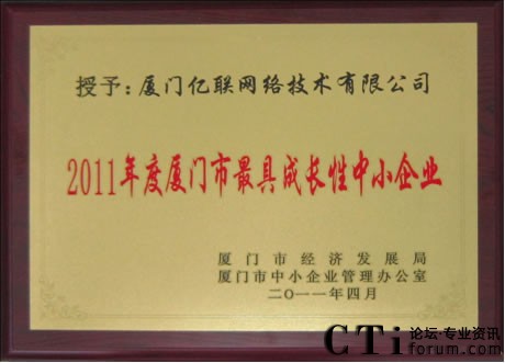 億聯(lián)喜獲2011年廈門市最具成長性中小企業(yè)獎