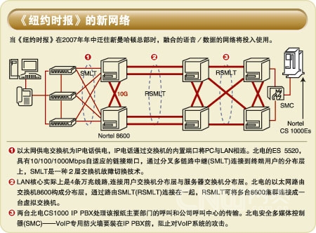 VoIP架構(gòu)是基于北電的通信服務(wù)器CS 1000平臺(tái),該平臺(tái)是一種基于服務(wù)器的IP PBX。CS 1000是基于北電的Meridian PBX特性集合,其主機(jī)運(yùn)行在一臺(tái)來自WindRiver系統(tǒng)公司的VxWorks實(shí)時(shí)操作系統(tǒng)的IP服務(wù)器上。一對(duì)冗余的CS1000將為新聞、廣告、發(fā)行和其他部門中大約3600 部IP電話以及部署在《紐約時(shí)報(bào)》的分類/顯示廣告呼叫中心的300部IP軟電話提供服務(wù)。CS 1000提供對(duì)34臺(tái)以上的媒體網(wǎng)關(guān)和18臺(tái)信令服務(wù)器(部署在網(wǎng)絡(luò)中為內(nèi)網(wǎng)連接的不同部門提供VoIP呼叫建立和信令的分布式專用設(shè)備)的集中管理。
