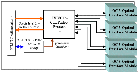 我們來看看下面PT4MC的區(qū)塊圖。這張圖提供了四個OC-3的界面,同時使用Utopia level 2來互相聯(lián)系網(wǎng)絡(luò)處理器。