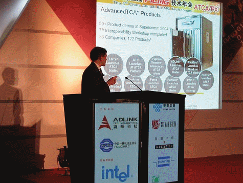 。。10月27日、28日,由中國計算機(jī)行業(yè)協(xié)會PICMG/P.R.C與凌華科技集團(tuán)共同主辦的中國第三屆PICMG技術(shù)年會在北京國際飯店成功舉行。和前兩屆年會相比,此次年會在規(guī)模上,尤其在規(guī)格上有了很大程度的提高。兩天時間內(nèi),有1000多名來自網(wǎng)絡(luò)通信、量測自動化領(lǐng)域的專業(yè)人士參加了此次論壇活動,來自Intel、凌華科技、Alcatel、SBS、Windriver、NMS、CCPU、Acqiris、Pickering、StarGen 等20多家國際知名企業(yè)的高層主管和諸多國際知名人士蒞臨現(xiàn)場,與到場觀眾就AdvancedTCA和PXI等業(yè)內(nèi)領(lǐng)先的技術(shù)和應(yīng)用展開深入的探討。
