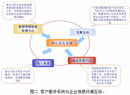 客戶服務系統(tǒng)不是孤立的系統(tǒng),是能夠與客戶現(xiàn)有信息環(huán)境,包括:核心業(yè)務系統(tǒng)、多渠道營銷、電子商務等進行互動的智能信息系統(tǒng),從而使呼叫中心成為企業(yè)的戰(zhàn)略資產(chǎn),幫助企業(yè)提升客戶滿意度、深度挖掘客戶價值?蛻舴⻊障到y(tǒng)與企業(yè)其它信息系統(tǒng)的互動可以通過圖二反映。
