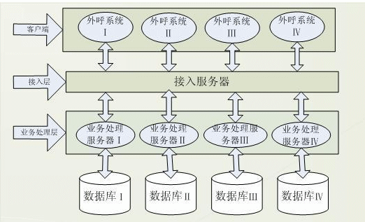 針對(duì)舊外呼業(yè)務(wù)系統(tǒng)的弊端及業(yè)務(wù)系統(tǒng)特點(diǎn),賽迪呼叫研發(fā)了基于三層C/S結(jié)構(gòu)的外呼業(yè)務(wù)系統(tǒng),該系統(tǒng)分客戶(hù)端,接入服務(wù)器,業(yè)務(wù)服務(wù)器及數(shù)據(jù)庫(kù)端?蛻(hù)端發(fā)送請(qǐng)求給分配服務(wù)器,接受到請(qǐng)求后,分配服務(wù)器根據(jù)客戶(hù)端的請(qǐng)求數(shù)據(jù)將其分配給自身的業(yè)務(wù)服務(wù)器做業(yè)務(wù)處理,這樣客戶(hù)端與業(yè)務(wù)服務(wù)器建立起聯(lián)系,結(jié)構(gòu)體系如圖: