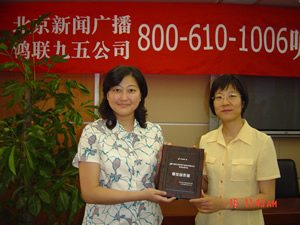 鑒于鴻聯(lián)九五信息處理中信與北京廣播電臺(tái)新聞臺(tái)的合作中所提供的高水平的服務(wù),近期,新聞臺(tái)李臺(tái)長在聽眾見面會(huì)上親自將最佳合作獎(jiǎng)交到鴻聯(lián)九五總經(jīng)理趙薇的手中,并熱切希望開拓今后合作,努力走出一條呼叫中心和媒體合作的新路。