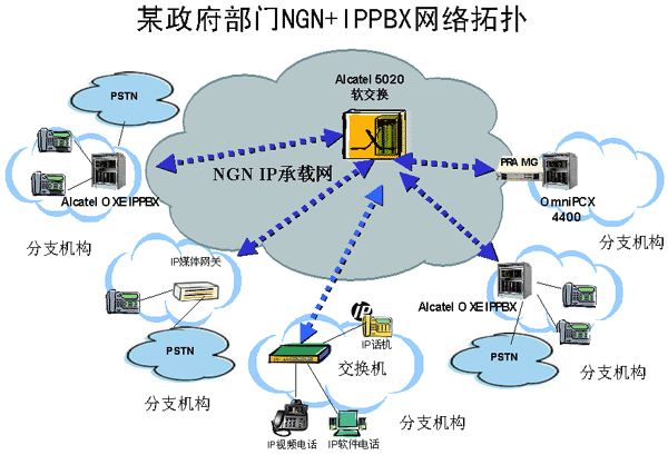 上海貝爾阿爾卡特提出的用NGN整合IP PBX的解決方案,在政府、郵政、酒店、跨國(guó)企業(yè)等領(lǐng)域得到了很多成功的應(yīng)用,下面以國(guó)家政府某部門的部署方案為例來(lái)詳細(xì)介紹NGN+IP