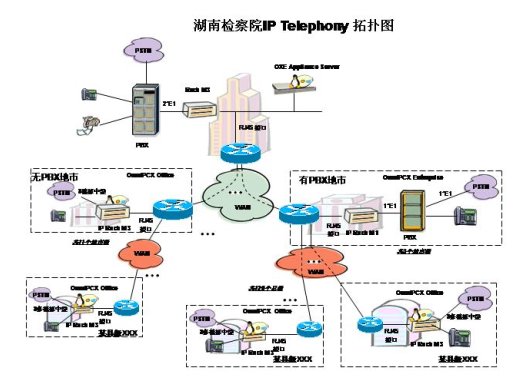 Office(面向中小型企業(yè)的通信平臺)系統作為分支交互節(jié)點。全網支持多達9000個用戶,覆蓋湖南省檢察院、14個地市檢察院和126個區(qū)縣檢察院。在設計組網方案時,阿爾卡特根據用戶的需求和實際情況,并充分考慮現有的數據網絡資源,提出采用點對多點的網絡結構建設VOIP語音網絡,不僅可以充分保障通信的安全性和可靠性,同時還可最大限度保護現有投資,節(jié)省費用。
