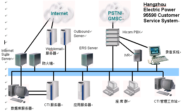 西門子Hicom 350E,作為杭州電力"95598"客服系統(tǒng)的通信服務(wù)器,以其出色的品質(zhì)和強(qiáng)大的功能保證了整個(gè)系統(tǒng)的正常運(yùn)行。同時(shí)充分利用杭州電力局原有的通訊線路,創(chuàng)新性的在原有的SDH(同步數(shù)字體系)網(wǎng)絡(luò)上利用HiPath HG 3200遠(yuǎn)端模塊,將中心的人工坐席延伸到了五個(gè)郊縣電力公司,真正解決了全市統(tǒng)一接入,一個(gè)號(hào)碼對(duì)外,業(yè)務(wù)本地受理的問題;同時(shí)遠(yuǎn)端坐席的工作方式真正做到和中心完全一致,給使用、管理、培訓(xùn)等帶來極大的便利。