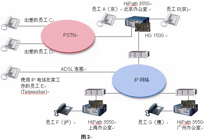 西門子推薦該公司每一個辦公室均采用HiPath 3550 PBX。如果,A公司每個辦公室已經(jīng)擁有DDN專線或ADSL連接至Internet,它就能將其內(nèi)部通信建設(shè)在現(xiàn)存的IP網(wǎng)絡(luò)的基礎(chǔ)之上。其集成網(wǎng)關(guān)HiPath 1500被用來連接數(shù)據(jù)網(wǎng)絡(luò)和語音網(wǎng)絡(luò)。在這樣的網(wǎng)絡(luò)架構(gòu)中,路由冗余能夠得到充足的保證,因為西門子HiPath解決方案提供了最大的網(wǎng)絡(luò)存活性:即使IP網(wǎng)絡(luò)出現(xiàn)故障,西門子網(wǎng)絡(luò)設(shè)置能夠?qū)⒙酚勺詣忧袚Q至PSTN之上。