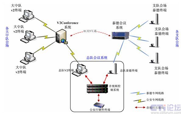 另外在廣東省消防信息系統(tǒng)內(nèi),現(xiàn)有硬件泰德電視電話會議系統(tǒng)共有23個終端節(jié)點(diǎn),主要基于獨(dú)立的IP專用網(wǎng)絡(luò),并與V2conference系統(tǒng)所在IP網(wǎng)絡(luò)相互獨(dú)立。為了達(dá)到和硬件系統(tǒng)共用互通,實(shí)現(xiàn)全網(wǎng)會議互通,在總隊(duì)會議系統(tǒng)中,將會議系統(tǒng)一級網(wǎng)(省公安廳——消防總隊(duì))、二級網(wǎng)(消防總隊(duì)——支隊(duì))、三級網(wǎng)(消防支隊(duì)——消防大中隊(duì))通過消防總隊(duì)會議控制系統(tǒng)和v2conference系統(tǒng)自帶的H.323互通功能模塊融合到一起。
