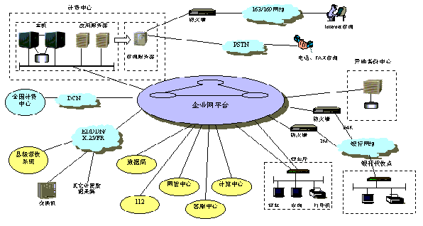 縣計(jì)費(fèi)中心采用64K DDN連接各營業(yè)廳和支局,縣銀行通過銀行網(wǎng)絡(luò)連入企業(yè)網(wǎng)平臺,鄉(xiāng)鎮(zhèn)代收點(diǎn)視具體條件的不同可采用DDN、ISDN或PSTN方式連入計(jì)費(fèi)中心。