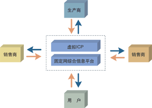 讓我們看看這樣一個應(yīng)用,以固定網(wǎng)綜合信息平臺為基本支撐平臺,以“虛擬ICP”為業(yè)務(wù)承載平臺,包含了銷售商、生產(chǎn)商、供應(yīng)商、消費用戶,形成了一個初步完整供應(yīng)鏈系統(tǒng),如圖所示。