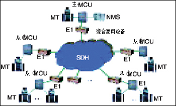 多點視頻會議系統(tǒng)主要由視聽多媒體會議終端MT、通信傳輸網絡SDH、網絡節(jié)點的多點控制單元MCU、網絡管理系統(tǒng)NMS以及外圍設備等幾部分組成。由于通信網絡不同,會議電視系統(tǒng)的終端和多點控制單元MCU也不盡相同。例如,對于采用電路交換通信網絡的多點會議系統(tǒng)通過MCU實現(xiàn),而包交換通信網絡則通過多點會議服務器來實現(xiàn)多方會議。如圖: