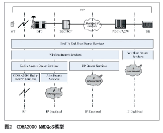 over IP稱為移動IP Phone。圖3顯示了CDMA2000 LMSD網(wǎng)絡(luò)為了滿足端到端QoS要求,而設(shè)置的多層不同承載服務(wù)級別、網(wǎng)元間的端到端QoS保證機制。