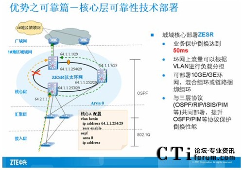 核心交換機主要是匯聚下行的全千兆智能路由交換機,所以要求設備提供高密度板卡和線速轉發(fā)的能力。同時保證對下行端口進行帶寬控制,中興采用萬兆路由交換機ZXR10 8905來滿足用戶的需求。ZXR10 8900系列萬兆路由交換機是中興通訊推出的新一代的大容量核心/匯聚路由交換機系列產品,主要定位于運營商IP城域網、校園網、電子政務網和大型企事業(yè)網等網絡的核心/匯聚層。ZXR10 8900系列萬兆路由交換機基于先進的模塊化理念進行設計,并采用了基于多處理器并行處理機制和Crossbar空分交換結構的體系結構,關鍵模塊均采用可以1:1進行冗余備份。ZXR10 8900系列具備10GE、GE、FE等各種豐富的接口模塊,并全面支持IPv4、IPv6、組播、QOS、帶寬控制等業(yè)務功能。ZXR10 8900系列整個系統所具備的高可靠性、高擴展性、良好的業(yè)務能力等特點,可以滿足各種網絡核心/匯聚層的建設需求。