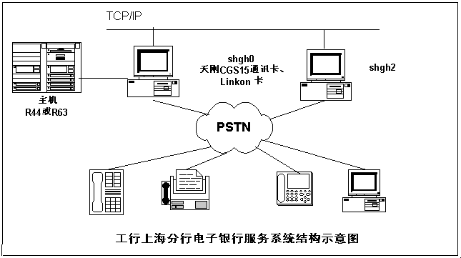 該系統(tǒng)以IBM提供的 R63和R44主機為中心,一臺Unix通信前置機通過CGS15通信卡與主機相連。該前置機與另一臺前置機連成局域網(wǎng),對外提供74線語音、傳真和MODEM服務。今后隨著業(yè)務的增長,可以通過增加通信前置機方式,增加對外服務線路,從而使系統(tǒng)具有良好的開放性和擴展能力。