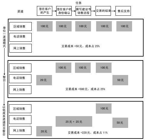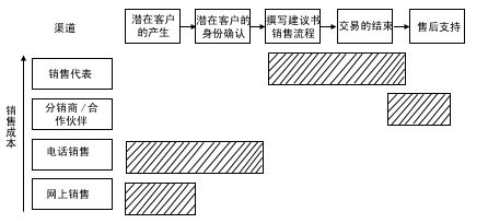 渠道整合強(qiáng)調(diào)在一個(gè)銷(xiāo)售過(guò)程中分工的不同給企業(yè)帶來(lái)更多的利潤(rùn),將銷(xiāo)售過(guò)程的任務(wù)一一分配給不同成本的渠道來(lái)完成。銷(xiāo)售過(guò)程的中間環(huán)節(jié)——面對(duì)面的銷(xiāo)售和交易的達(dá)成,通常需要由成本較高的區(qū)域銷(xiāo)售代表和分銷(xiāo)伙伴來(lái)完成,客戶的產(chǎn)生及身份的確認(rèn)和售后服務(wù)環(huán)節(jié)通常由低成本渠道完成,F(xiàn)在,我們對(duì)照?qǐng)D4來(lái)比較一下: