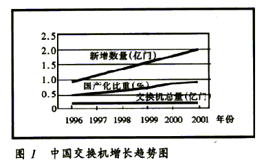 2000年,中國公用通信網(wǎng)上局用程控交換機的總?cè)萘窟_到1.79億門,國內(nèi)生產(chǎn)設(shè)備的比重達80%。預計2001年新增交換機容量2100萬門,總?cè)萘窟_到2億門,國內(nèi)生產(chǎn)設(shè)備的比重超過85%,增長趨勢見圖1。