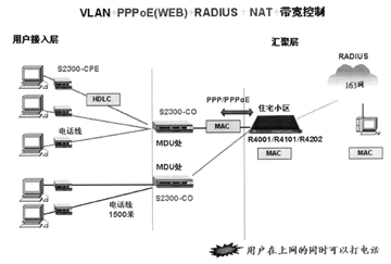 圖2所示的是VDSL技術(shù)與以太網(wǎng)技術(shù)聯(lián)合打造的新型接入方案。武漢烽火網(wǎng)絡公司生產(chǎn)的S2300系列VDSL交換機使用戶在現(xiàn)有電話線路上獨立享用固定的獨立的帶寬,安全地進行數(shù)據(jù)連接,同時以太網(wǎng)的PPPoE認證、NAT地址變換等功能又將用戶帶入迷幻的網(wǎng)絡世界。