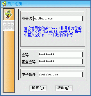 DICO下載后的安裝過(guò)程比較簡(jiǎn)單: "接收協(xié)議"后一路"下一步"就OK了。然后是注冊(cè),過(guò)程也委簡(jiǎn)單:運(yùn)行后,第一次使用時(shí)點(diǎn)"注冊(cè)"(以后使用時(shí)只要輸入用戶名或密碼登錄就是了),隨后的"用戶注冊(cè)"窗口中填寫好相關(guān)的選項(xiàng)后點(diǎn)"確定"(下圖2)就OK了!