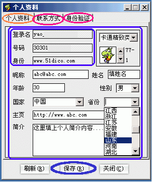 、冱c(diǎn)按"個(gè)人資料"命令(圖3的B1處),彈出"個(gè)人資料"修改窗口,包括"個(gè)人資料/聯(lián)系方式/身份驗(yàn)證"這三大類選項(xiàng)卡。其中:"個(gè)人資料"選項(xiàng)卡下,除登錄名、號(hào)碼和身份這三項(xiàng)不可更改外,其余各項(xiàng)都是可填或可選項(xiàng),據(jù)你所需進(jìn)行修改就是了(下圖4)。另外,還有"聯(lián)系方式"和"身份驗(yàn)證"兩大選項(xiàng),怎么個(gè)用法自己點(diǎn)開一看就明白了你!