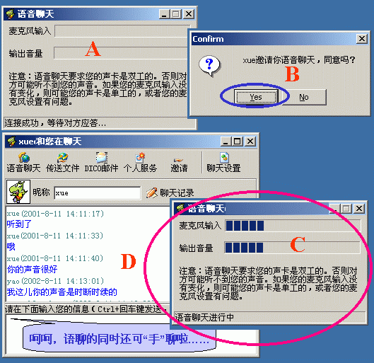 在好友窗口內(nèi)單擊某"在線好友頭像"后選"語(yǔ)音聊天"命令(或在即時(shí)聊天窗口中點(diǎn)按"語(yǔ)音聊天"按鈕)后,主動(dòng)方彈出"正等待對(duì)方應(yīng)答窗口提示";而被叫方會(huì)彈出"應(yīng)答與否的窗口","YES"后雙方即可聊了(下圖9)。而且,它不受防火墻的限制(下圖就是我與一個(gè)在防火墻后的朋友的聊天界面)。在這一點(diǎn)上,QQ就望塵莫及了!