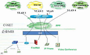 VPN中,實(shí)現(xiàn)業(yè)務(wù)在VLAN 和VPN中的無(wú)縫對(duì)接,以保證用戶數(shù)據(jù)的安全、高效傳輸;接入網(wǎng)采用基于RPR或SDH的MSPP環(huán)實(shí)現(xiàn)IP業(yè)務(wù)和TDM業(yè)務(wù)的綜合傳輸;在商業(yè)樓宇內(nèi)主要采用IAD設(shè)備將客戶的數(shù)據(jù)、語(yǔ)音、專線等業(yè)務(wù)接入CNC