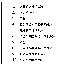 10. 來(lái)自公司高層的認(rèn)可。這是一個(gè)非常有效的作法,能得到公司高層的認(rèn)可對(duì)很多人來(lái)說(shuō),是一生都可以值得回憶的事情。如果在一家全球的大公司,和公司CEO共同進(jìn)餐,得到公司CEO的親筆信,和CEO合影等都是非常高的榮譽(yù)。當(dāng)然,這個(gè)作法不是可以經(jīng)常用的。因?yàn)椋绻玫锰?jīng)常了,就可以失去了一種"神秘感"或"來(lái)之不易"的感覺(jué)。