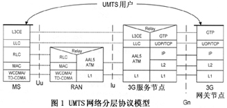對圖1的簡要描述如下:移動用戶(MS)到RAN左側(cè)部分是無線接入網(wǎng)絡(luò)的無線用戶接口(Uu),實現(xiàn)了用戶業(yè)務(wù)通過空中無線鏈路接入3G網(wǎng)絡(luò)的功能,主要包含物理層(采用WCDMA和TD-CDMA技術(shù))、媒體接入層(MAC)、無線鏈路層(RLC);在RAN內(nèi)部通過協(xié)議中繼(Relay)實現(xiàn)無線鏈路和有線鏈路的對接;在RAN和3G服務(wù)節(jié)點之間的接口(Iu)是以ATM技術(shù)為支撐的有線接入段協(xié)議,為支持Internet業(yè)務(wù),采用AAL5適配層協(xié)議,物理層(L1)無明確限定具體傳輸方式;在此之上,透過RAN、MS和3G服務(wù)節(jié)點之間存在兩個高層連接,即邏輯聯(lián)絡(luò)層(LLC)和更為復(fù)雜的第三層實體(L3CE),L3CE是一些以Client/Server方式構(gòu)件的軟件實體,實現(xiàn)諸如無線資源管理、呼叫控制、移動管理等網(wǎng)絡(luò)級功能;在3G服務(wù)節(jié)點內(nèi)部,為實現(xiàn)到Internet網(wǎng)絡(luò)的接入,再作一次協(xié)議中繼,這里,第三層實體的信息映射到通用分組無線服務(wù)的隧道協(xié)議GTP(GPRS Tunneling Protocol);3G服務(wù)訪問點到3G網(wǎng)關(guān)之間的Gn接口存在清晰的、以TCP/IP協(xié)議為主體的五層對應(yīng)關(guān)系;構(gòu)建在最上層的是移動用戶到3G網(wǎng)關(guān)的UMTS用戶進程,它通過3G網(wǎng)關(guān)進入Internet骨干網(wǎng),最終實現(xiàn)用戶對Internet的訪問。