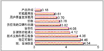 用戶重要性評價較高4≤Y<4.5的指標主要有:穩(wěn)定可靠性、技術(shù)支持和售后服務、多媒體功能強大、安全性四項。由于視頻會議系統(tǒng)提供的是實時視音頻交互通訊,系統(tǒng)的任何不穩(wěn)定都會在圖像和聲音上表現(xiàn)出來,因此穩(wěn)定可靠性對視頻會議系統(tǒng)來說是至關(guān)重要的。