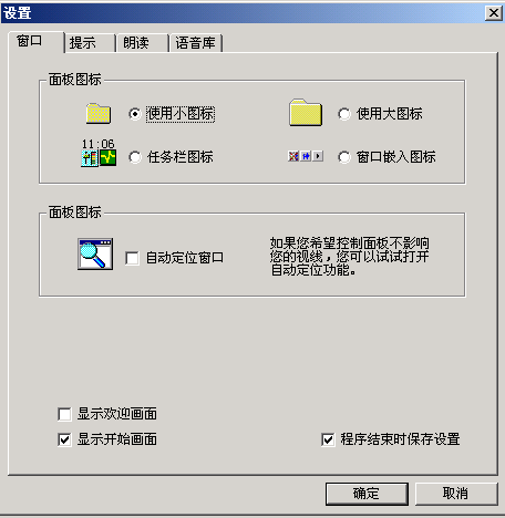 如果需要進一步的調整,可以選擇菜單里的“設置……”。打開設置窗口(如圖3)。窗口共分四個選項,每個選項里除了剛介紹的幾種常用功能調整外,還可以控制歡迎畫面、開始畫面、設定存儲等功能,規(guī)定提示速度、朗讀速度的快慢,選擇提示方式,設定提示報警條件。在“語音庫”選項中還可以選擇朗讀為男聲還是女聲。單擊“設置”按鈕,可以根據(jù)具體需要選擇“鍵盤”或“中文”里被朗讀標點符號的種類(如圖4)。