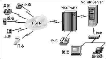 用語音板卡搭建電話會議一般注重在單一的音頻通信?紤]到單純的音頻或視頻會議模式都或多或少有各自的局限性,宇音將數(shù)據(jù)與語音整合在一起,實(shí)現(xiàn)音頻/圖文會議。VCTalk各系列電話會議系統(tǒng)采用高性能的語音/會議資源卡作為硬件支持,可實(shí)現(xiàn)多方電話會議(≥8),具有多組會議、與會者身份認(rèn)證、設(shè)置會議主持人、邀請與會者、會議通知、會議內(nèi)容同步播放、會議密碼保護(hù)、智能播放、會議內(nèi)容全程錄音/存儲、本地/遠(yuǎn)程查聽會議錄音的功能,并可以對企業(yè)內(nèi)部發(fā)生的呼叫記錄進(jìn)行計(jì)費(fèi)和統(tǒng)計(jì)。針對中小企業(yè)辦公靈活的特點(diǎn),VCTalk系統(tǒng)搭建簡單易行,其結(jié)構(gòu)圖見圖1。