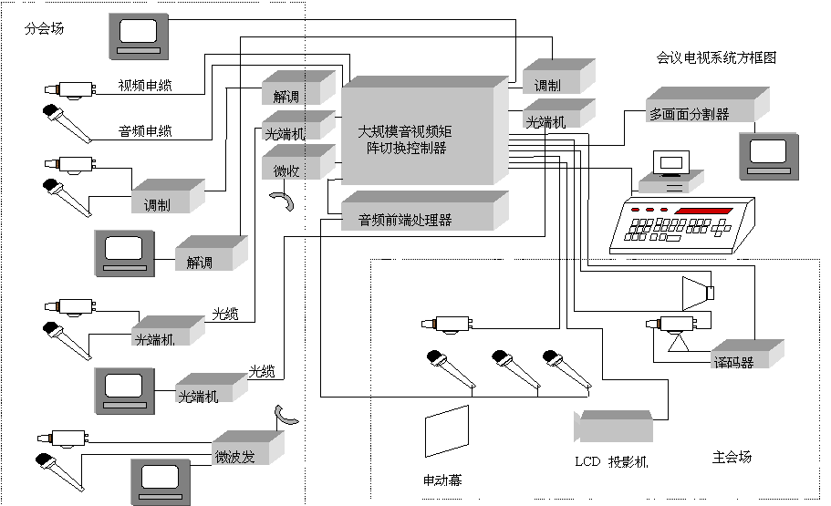 會議主機(jī)實現(xiàn)分會場和主會場的電視信號的交互切換,將各個分會場的電視信號送到液晶投影儀上顯示,采用液晶投影儀作大屏幕顯示在電視墻顯示方式,投資小,設(shè)有閃爍感,使主會場人員的視覺更舒適(參見系統(tǒng)圖)。