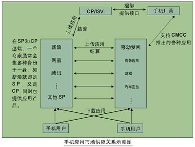 在這樣一個全新的銷售模式下,運(yùn)營商的作用也越發(fā)凸顯出來!皦艟W(wǎng)是一個大的平臺,SP是個小平臺,SP再通過與CP建立合作,進(jìn)而將整個應(yīng)用市場與終端連接起來,F(xiàn)在,我們?nèi)康膽?yīng)用都放到夢網(wǎng)上面了!北本﹫(bào)童電子商務(wù)公司的一個工作人員說。移動夢網(wǎng)的建立,事實(shí)上在手機(jī)廠商、應(yīng)用開發(fā)商、用戶三者之間搭了一個橋梁,將各種手機(jī)應(yīng)用集中在一個門戶網(wǎng)站,用戶需要時,只需登陸到夢網(wǎng)上面,點(diǎn)擊相關(guān)的網(wǎng)頁,就可隨時下載所需要的應(yīng)用。