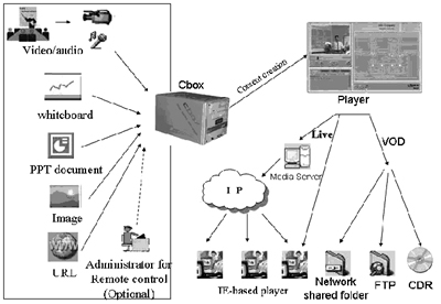 在對市場上現(xiàn)有產(chǎn)品進(jìn)行了綜合比較后,上海市稅務(wù)局決定使用美國Winnov公司的Cbox系統(tǒng)。Cbox是一種視頻采集和控制系統(tǒng),可以支持多種格式文檔,通過URL方式可以提供對未來文檔格式的支持,在操作時(shí)只需將文檔提供給Cbox,其余工作由Cbox自動(dòng)完成; 自動(dòng)攝像頭控制可預(yù)設(shè)三個(gè)位置,Cbox自動(dòng)感應(yīng),并支持助教、直播、點(diǎn)播等模式,同時(shí)具有多種分發(fā)方式,可以存在局域網(wǎng)共享目錄、自動(dòng)上傳至FTP和刻錄光盤。