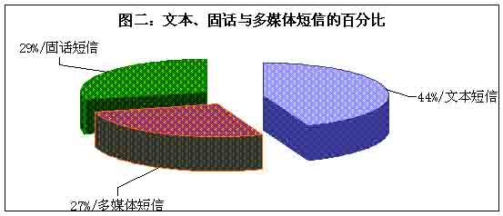 目前市場的主流短信主要有三大類,即傳統(tǒng)的手機文本短信、流行的圖音文字兼?zhèn)涞摹安市拧焙托峦瞥龅墓淘挾绦拧U麄短信市場確實火了,但是在火爆的背后哪一種短信是真正的巨無霸?調(diào)查表明,在三類短信之中,選擇文本類短信的用戶最多,占據(jù)44%,其次是固話短信,再次是多媒體短信,即俗稱的“彩信”,選擇固話短信和彩信的百分比十分接近。(見圖二)看來,“巨無霸”非文本類短信莫屬。