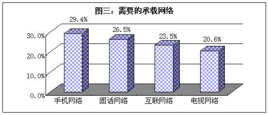 首先,手機構(gòu)成移動的網(wǎng)絡(luò)已經(jīng)超過傳統(tǒng)的龐大的固話網(wǎng)絡(luò),成為用戶目前用戶最需要的承載網(wǎng)絡(luò)。這顯然是用戶市場對移動通訊方式的需求日漸強烈的表現(xiàn)。其次,電視網(wǎng)絡(luò)拉后于固話和互聯(lián)網(wǎng)絡(luò),排在最后一位,這反映了未來網(wǎng)絡(luò)向雙向溝通發(fā)展的態(tài)勢。最后,互聯(lián)網(wǎng)絡(luò)雖然早于移動網(wǎng)絡(luò)的發(fā)展,而用戶卻更為看重后者,原因是作為互聯(lián)網(wǎng)絡(luò)終端設(shè)備的電腦,還不能走入普通百姓家庭,因此終端設(shè)備成為互聯(lián)網(wǎng)絡(luò)發(fā)展的門檻。