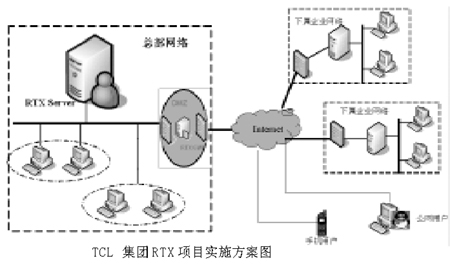 為充分發(fā)揮現(xiàn)有信息基礎(chǔ)設(shè)施和IT應(yīng)用的作用,促進(jìn)企業(yè)的實(shí)時(shí)商務(wù)運(yùn)作,節(jié)約開支,集團(tuán)公司在廣泛調(diào)查實(shí)時(shí)企業(yè)IM軟件的基礎(chǔ)上,于2002年10月對(duì)騰訊公司的RTX實(shí)時(shí)應(yīng)用軟件前身BQQ進(jìn)行了嚴(yán)格的評(píng)估和論證,認(rèn)為在如下幾個(gè)方面騰訊公司的企業(yè)IM軟件能夠解決TCL集團(tuán)公司面臨的實(shí)際問題:①業(yè)務(wù)地點(diǎn)分散,網(wǎng)絡(luò)結(jié)構(gòu)復(fù)雜;②業(yè)務(wù)復(fù)雜,無(wú)法形成集中統(tǒng)一的工作流管理系統(tǒng);③人員素質(zhì)差異性較大,復(fù)雜的IT應(yīng)用如OA系統(tǒng)等應(yīng)用推廣受到一定阻力;④集團(tuán)內(nèi)部缺乏一個(gè)公共實(shí)時(shí)交流平臺(tái),企業(yè)內(nèi)部溝通不暢;目前集團(tuán)公司內(nèi)部主要通過電話、傳真和E_mail這些傳統(tǒng)工具傳遞信息,企業(yè)的實(shí)時(shí)化大受影響。而且騰訊公司的RTX產(chǎn)品投入低,上手快,于是TCL集團(tuán)領(lǐng)導(dǎo)決定上馬RTX項(xiàng)目,自上而下推廣RTX項(xiàng)目。