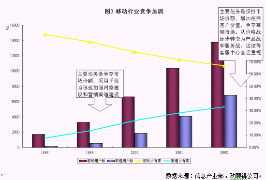 拿移動通訊業(yè)務(wù)來說,如圖3所示,截至到2002年底,中國移動的市場份額大約在65%,而聯(lián)通為35%左右,網(wǎng)絡(luò)覆蓋以及質(zhì)量也越來越趨同。從國內(nèi)國外的經(jīng)驗來看,移動通訊市場的競爭正從爭奪市場份額轉(zhuǎn)變?yōu)楸3质袌龇蓊~和增加客戶價值,而主要手段正也從網(wǎng)絡(luò)建設(shè)、營銷渠道建設(shè)、價格戰(zhàn)等轉(zhuǎn)變?yōu)楫a(chǎn)品戰(zhàn)和服務(wù)戰(zhàn)。在這個階段,兩家主要的運營公司都對客戶服務(wù)非常重視。服務(wù)水平的達(dá)標(biāo),投訴流程的梳理,呼叫中心的擴大規(guī)模,電話營業(yè)廳的建設(shè)等工作是今年的重點。