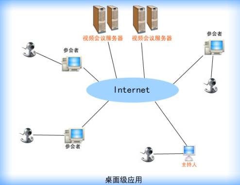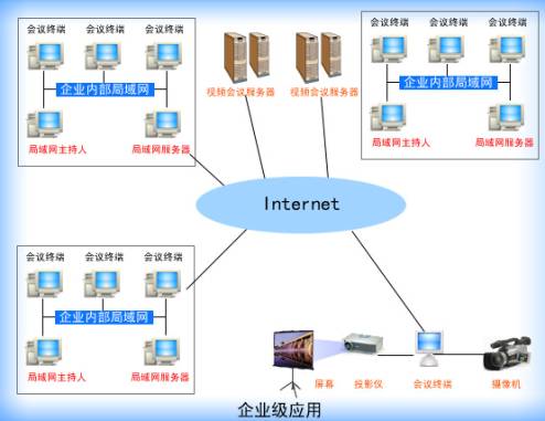 在企業(yè)級別的應(yīng)用中,企業(yè)將服務(wù)器構(gòu)架在公司內(nèi)部,遠(yuǎn)程用戶及局域網(wǎng)內(nèi)部的用戶均可登錄服務(wù)器,實現(xiàn)交互。企業(yè)級視頻會議系統(tǒng)的應(yīng)用實際上就是將桌面級視頻會議與會議室級視頻會議系統(tǒng)有機(jī)的結(jié)合在一起,客戶端硬件外設(shè)可以按照以上的建議,根據(jù)各終端不同的需求進(jìn)行配置。