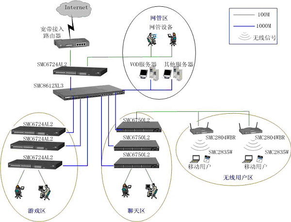 下圖為SMC網(wǎng)吧組網(wǎng)方案拓?fù)鋱D
