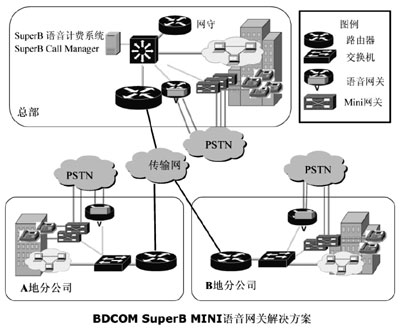 根據(jù)西北石油公司各地分公司電話全部是PSTN直線電話,沒有單位內(nèi)部的PBX,不能通過語音網(wǎng)關(guān)把這些直線電話統(tǒng)一接入到IP網(wǎng)絡上這一實際情況,方案提供方博達公司提供了一款小型BDCOM SuperB Mini語音網(wǎng)關(guān),來解決PSTN程控電話統(tǒng)一接入IP語音網(wǎng)絡的問題。使用BDCOM SuperB Mini并結(jié)合西北石油公司組建的企業(yè)內(nèi)部VoIP網(wǎng)絡,克服了傳統(tǒng)語音網(wǎng)關(guān)解決方案的不足和缺點。
