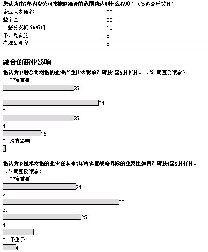 我們調(diào)查的企業(yè)中,有超過三分之二將在未來五年內(nèi)實現(xiàn)大多數(shù)或者所有部門向融合網(wǎng)絡(luò)的轉(zhuǎn)型。大部分企業(yè)采取按部就班的形式在某些特殊部門和業(yè)務(wù)開始部署。在融合應(yīng)用中,IP語音電話將在未來三年內(nèi)吸引大量投資;管理人士期望通過大幅削減公司內(nèi)部的通話費用獲得早期的回報。在更廣泛的層面上,大多數(shù)管理者預(yù)計,融合網(wǎng)絡(luò)對其企業(yè)的商業(yè)影響將會“非常重要”或者“重要”。