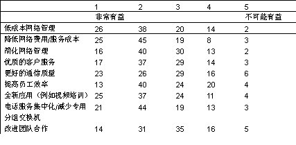 您認(rèn)為融合網(wǎng)絡(luò)將怎樣使您的企業(yè)受益(現(xiàn)在或者將來)?請為每一項打1至5分,1表示非常有益,5表示不可能有益。(% 調(diào)查反饋者)