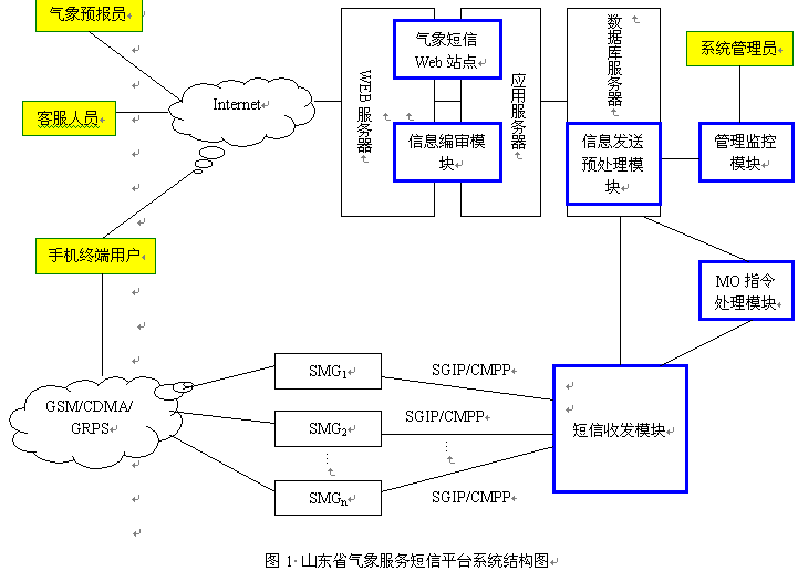 山東省氣象臺為實現(xiàn)“1210手機氣象站”服務(wù),通過技術(shù)合作的方式建設(shè)了山東省氣象服務(wù)短信平臺。該平臺采用操作系統(tǒng)無關(guān)、開放性好的J2EE軟件架構(gòu),數(shù)據(jù)庫選用處理能力強、穩(wěn)定性好的Oracle9i大型數(shù)據(jù)庫系統(tǒng),該平臺目前正在為全省50萬用戶每天通過短消息提供各種天氣預(yù)報服務(wù)。下面將主要介紹氣象短信平臺的系統(tǒng)結(jié)構(gòu)、各模塊功能和系統(tǒng)特點。