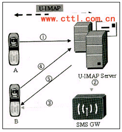 2)UIMAP Server把郵件存入目標(biāo)手機(jī)終端B的郵箱,并向短信中心發(fā)送新郵件到達(dá)的短信以通知用戶(hù);